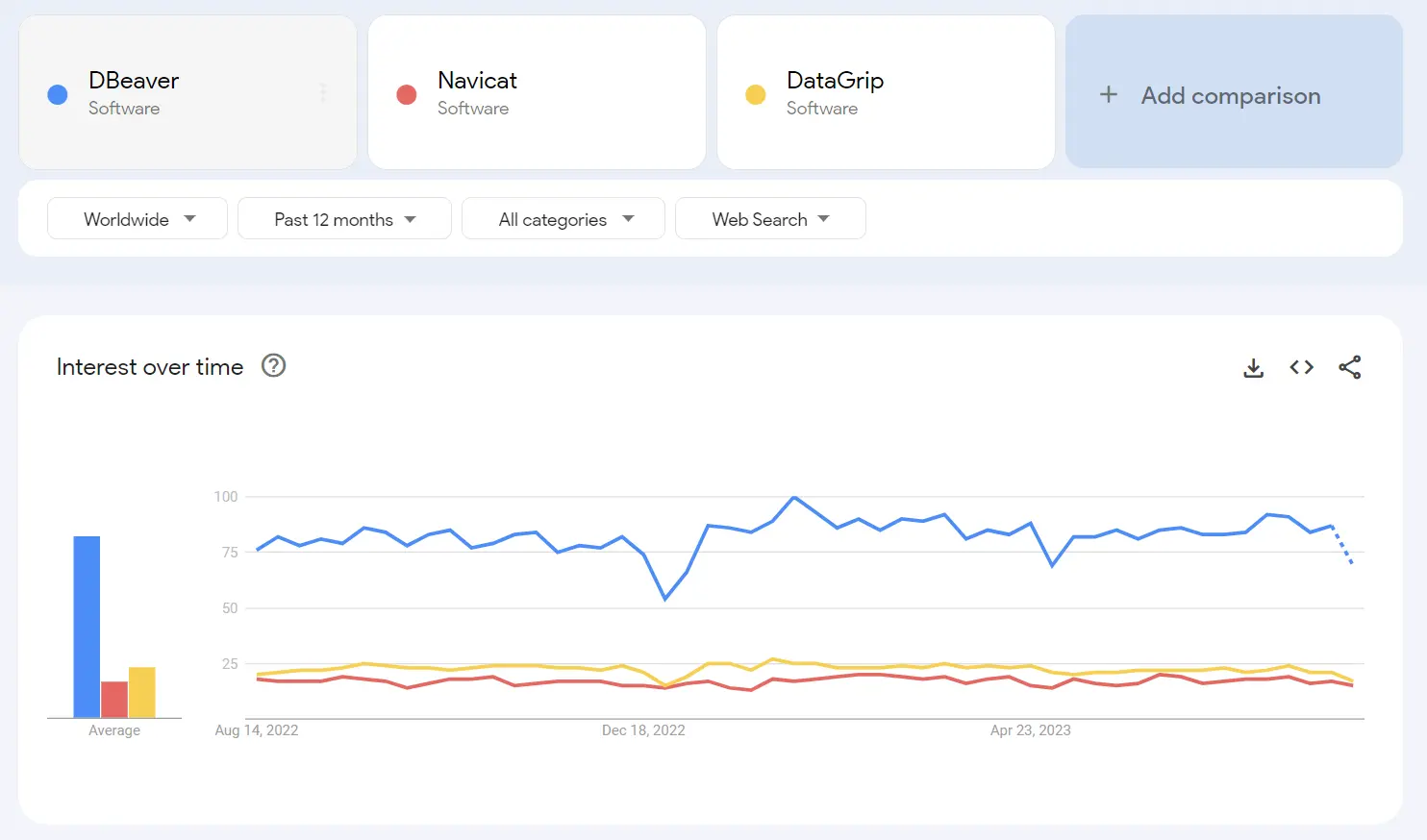 DBeaver is one of the most popular database management tools out there. Take a look at the Google Trends chart of the search term "DBeaver" as compared to two of its alternatives over the past 12 months, it's obvious that DBeaver is easily the most searched of the trio by a trifold.